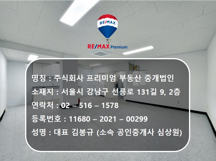 REMAX PREMIUM 중개법인 심상원 실장입니다. 리맥스 프리미엄 중개법인은 실제 답사한 내용과 사진으로 매물 소개를 드리고 있습니다 . 직접 답사하고 확인한 매물인 만큼 누구보다도 정확하게 매