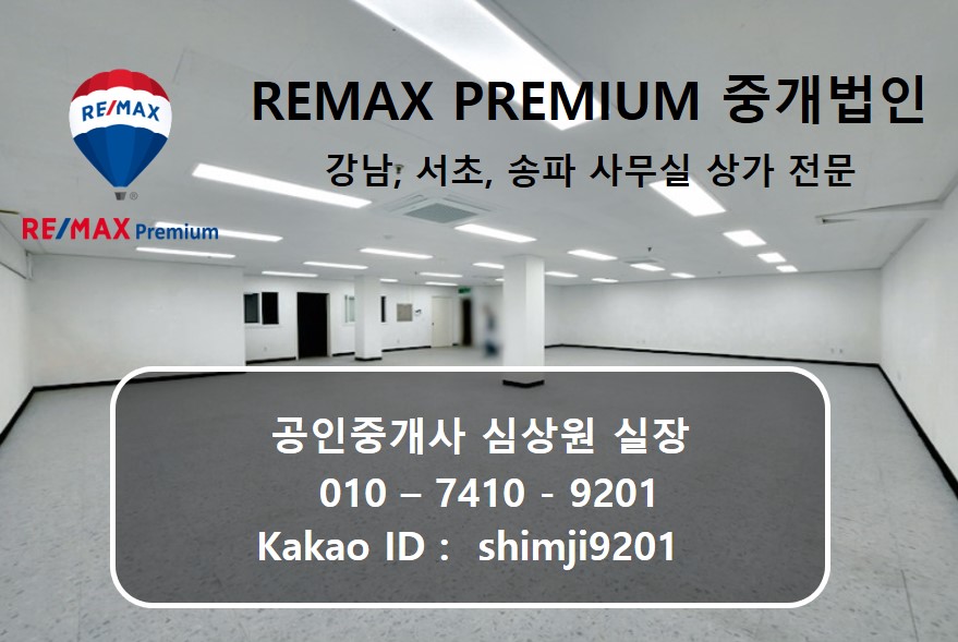 안녕하세요. 강남, 서초, 송파구 사무실/상가 임대 전문 리맥스 프리미엄 중개법인의 심상원 실장입니다. 저희 리맥스 프리미엄 중개법인은 허위 매물이 아닌 실제 계약 가능한 매물들로만 소개