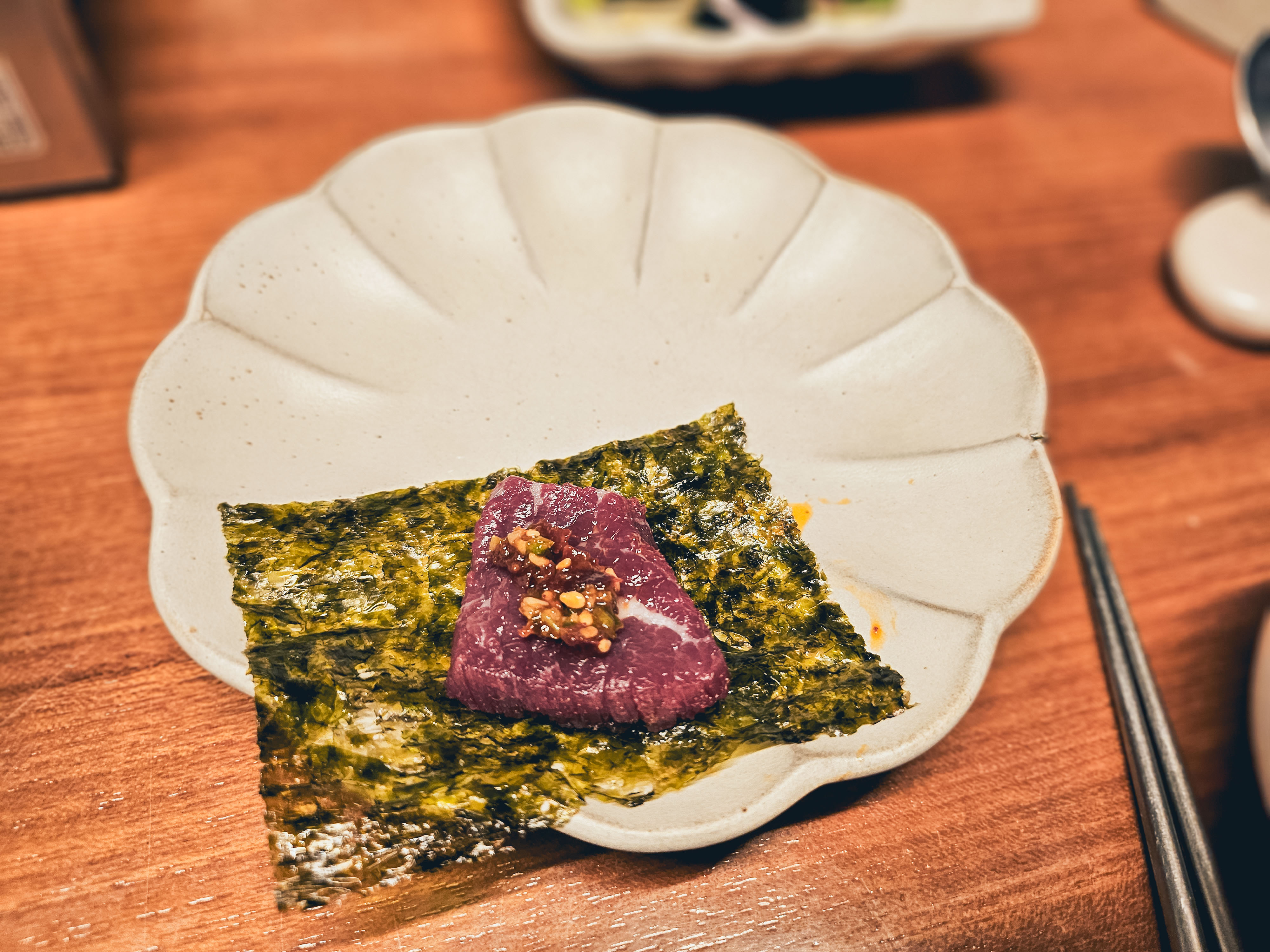 점심메뉴도 너무 맛있지만, 시그니처 육 사시미 메뉴도 맛있는 것 같습니다.
