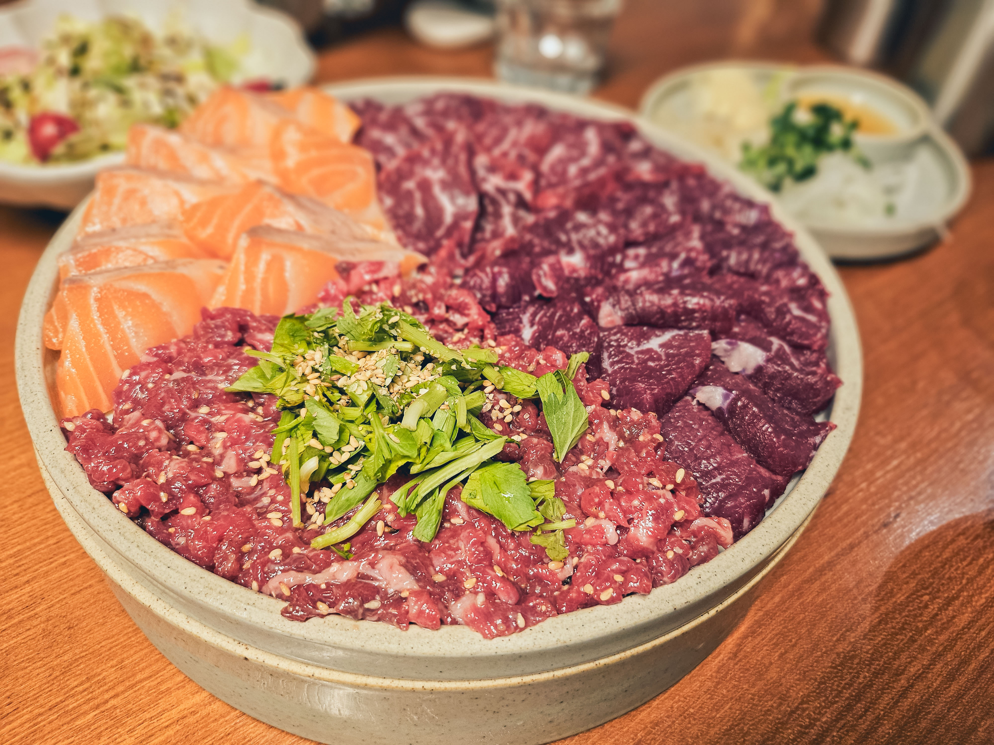 뭉티기와 한우사시미, 육회, 연어 사시미 4종 SET입니다.