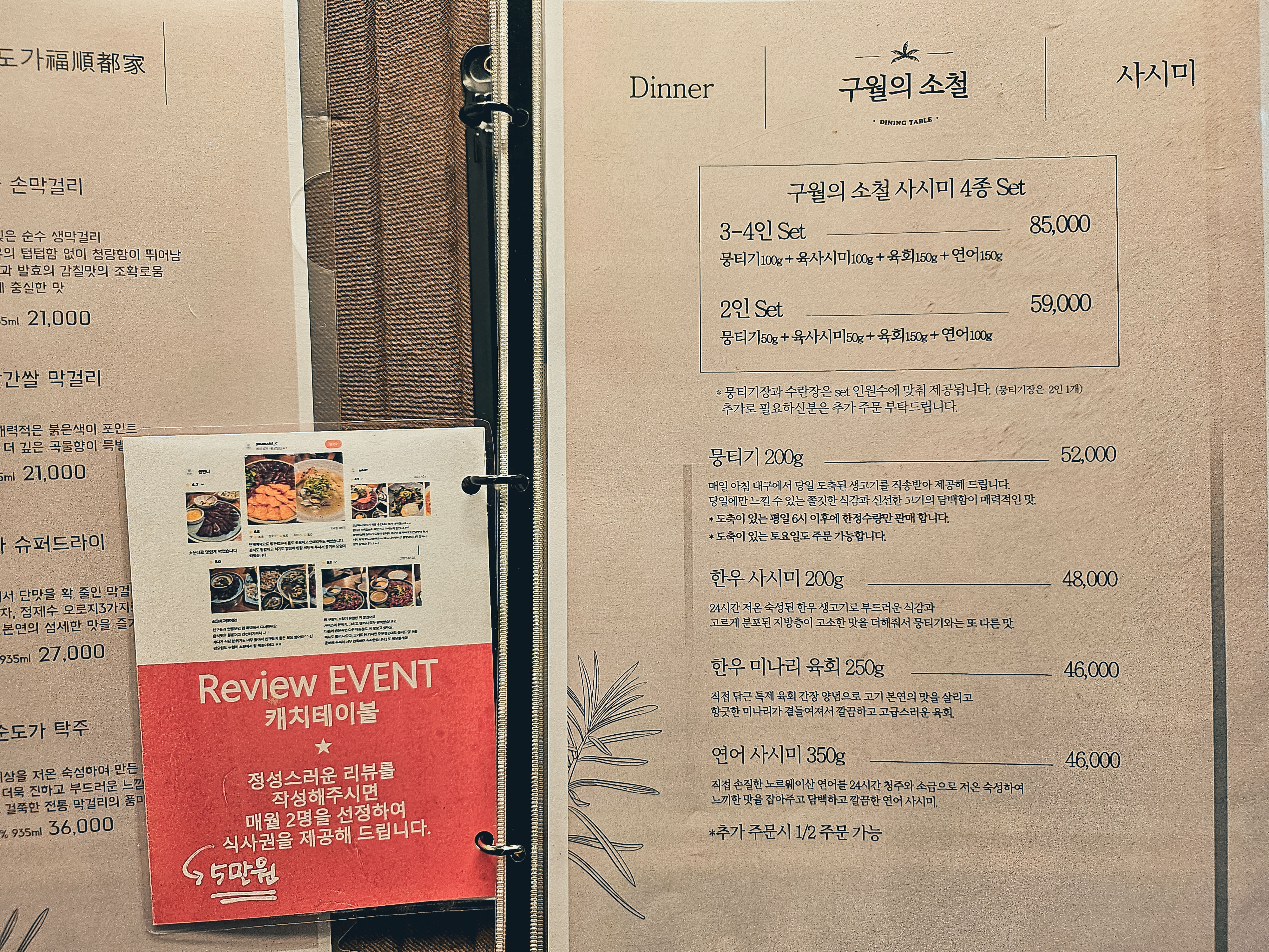 저녁에 룸으로 예약하는 경우 무조건 사시미 메뉴는