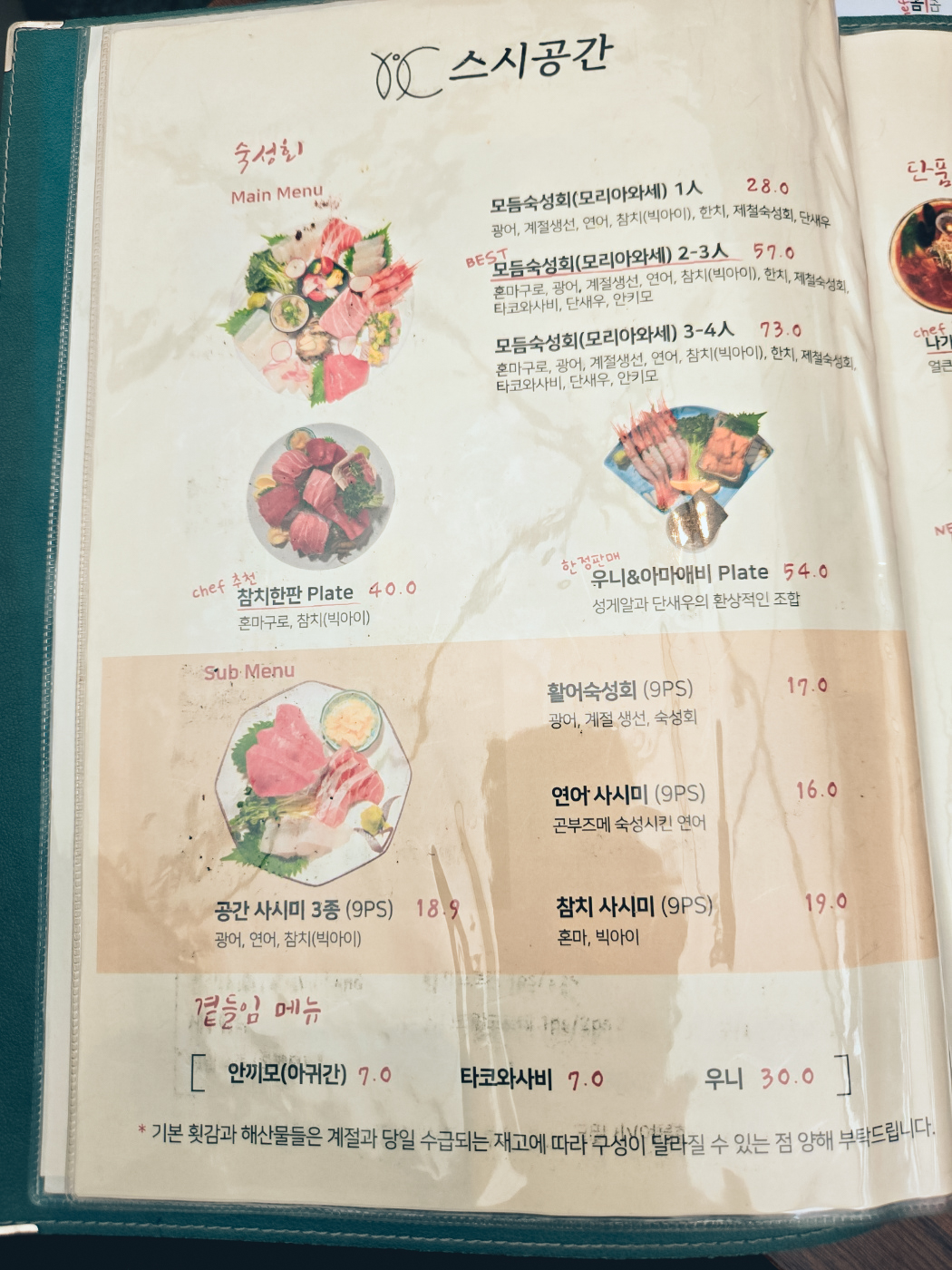 초밥, 후토마끼뿐만 아니라 각 종 사시미, 숙성회, 참치 회 종류들