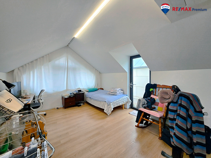 다락방 같은 느낌의 3층으로 충분한 채광을 위한 창문과 외부 테라스 공간이 있습니다.