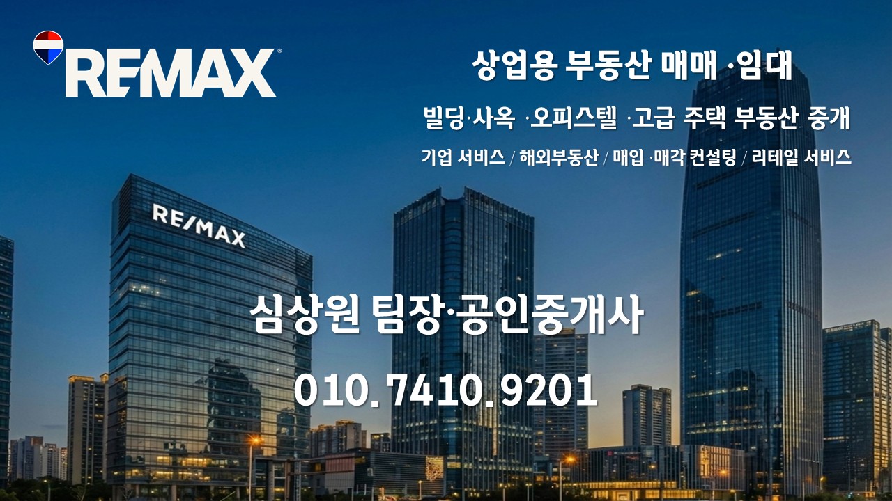전 세계 110개국, 8,000여 개의 광범위한 네트워크를 통해 글로벌 스탠다드 부동산 서비스를 제공하는 리맥스 프리미엄(REMAX Premium) 중개법인 심상원 팀장입니다.